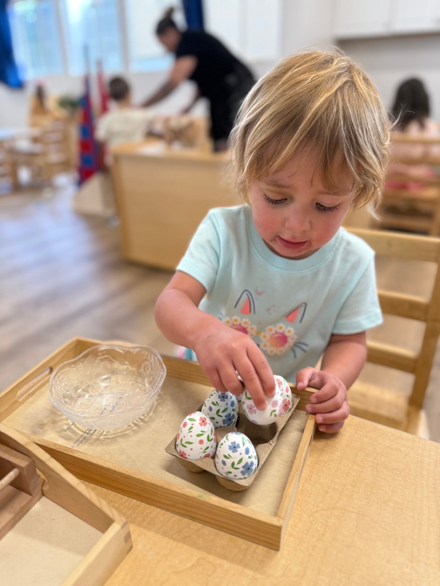 In April we welcomed spring by integrating flowers into our classroom’s practical life area. Our children practiced their pouring skills with items such as flamingos in representation of tropical islands. We learned the proper way to handle a chair such as carrying it and pushing it and our older friends had fun demonstrating their skills in front of the younger ones. The children in pre-primary had fun on our Spring Egg Hunt! Many were excited to show their parents all the awesome items that were donated!