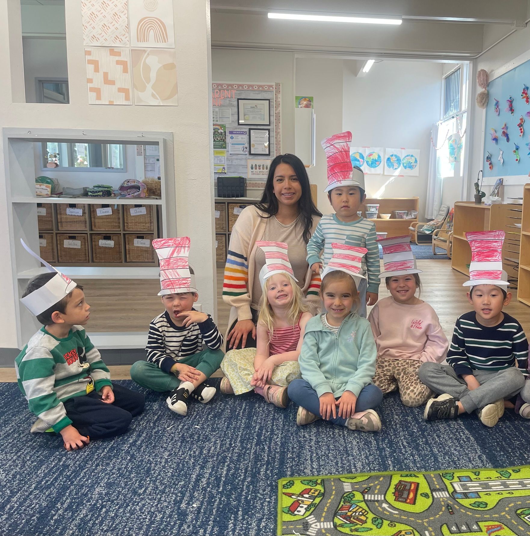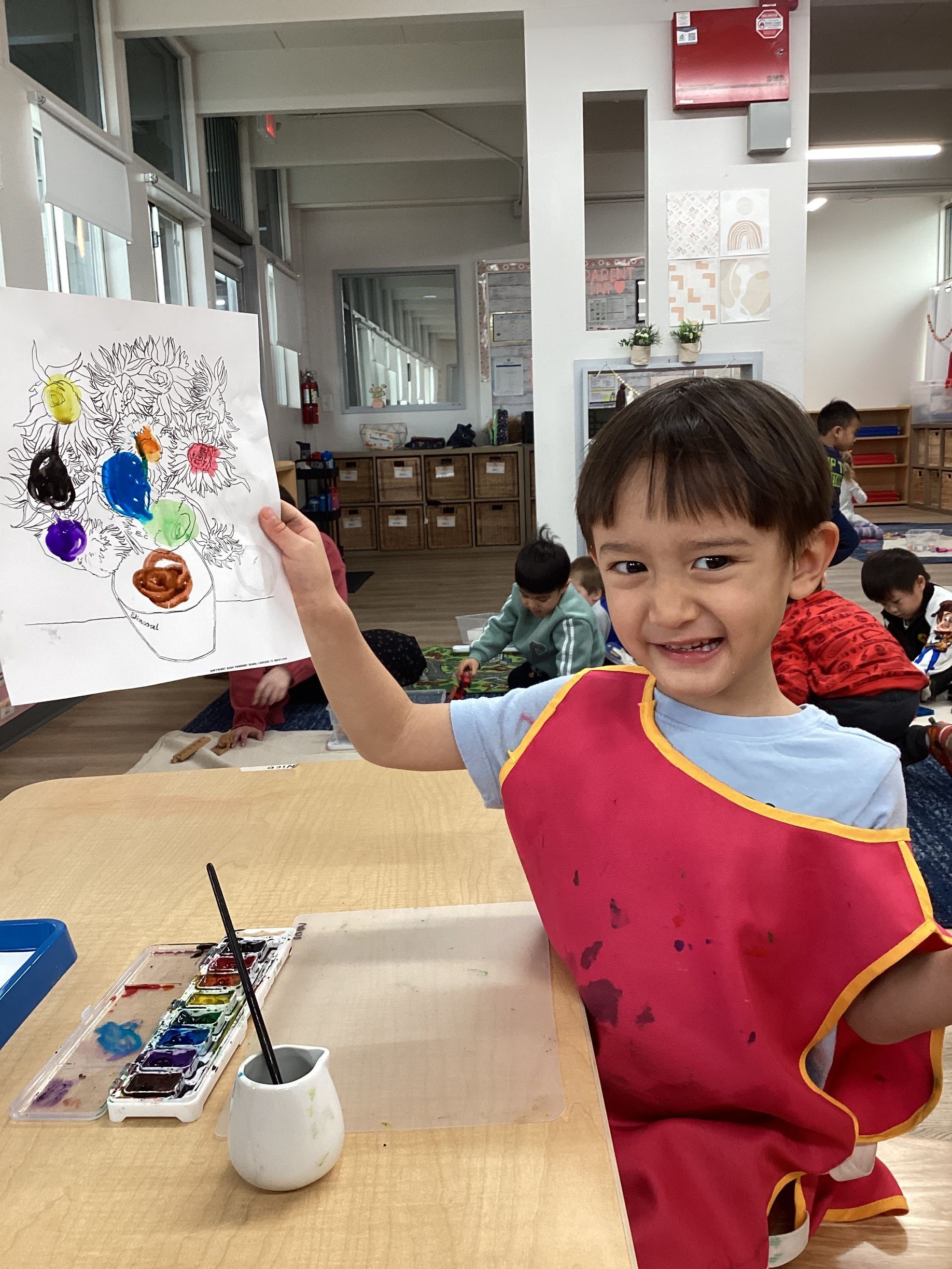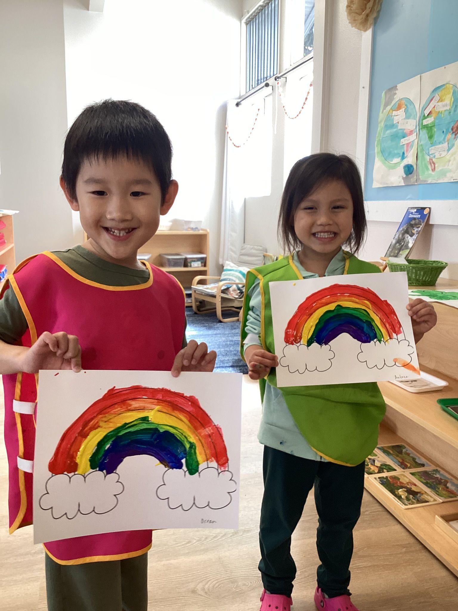 We celebrated Dr. Seuss’s birthday with a fun spirit week and read our favorite books by Dr. Seuss! We continued the March celebrations with a special St. Patrick’s Day party and painted rainbows. The older children attached their rainbow rhymes to their paintings. We explored how a rainbow forms using a sunlight prism as demonstration. We imagine sunlight as a bag of all the colors mixed, and when sunlight passes through the raindrops (the prism), they act like tiny prisms, which are special shapes that can split light into colors. When the raindrops bend into the sunlight, we see the colors of the rainbow!
