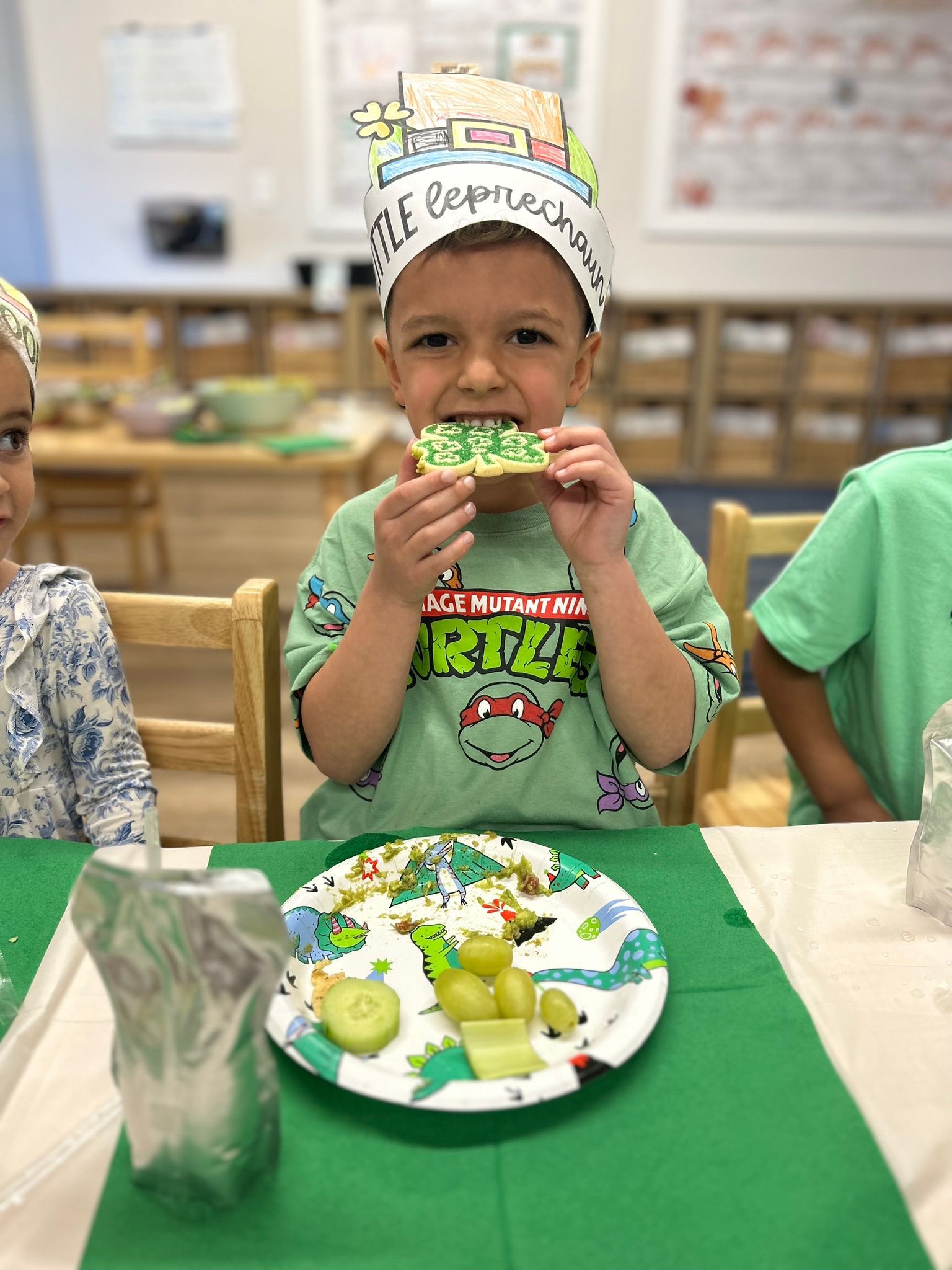 Students were also busy celebrating Dr. Seuss' birthday and St. Patrick's Day. For enrichment students made their own versions of Green Eggs and Ham. They used pretzels, white chocolate and, of course, green M&Ms. They then created hats to look just like the cat in Dr. Seuss books. This created such a fun celebratory month! To celebrate St. Patrick’s Day, the classrooms was filled with activities including shamrocks, gold and rainbows. In practical life students used rainbow erasers with thongs and spoons to practice their fine motor skills. In the math section they used gold coins to practice number recognition and counting in Spanish. For art, students used green tissue paper and a template to make shamrocks. They also got to explore textures and sensory skills by making green slime. They topped it with gold glitter then placed it in a black pot.