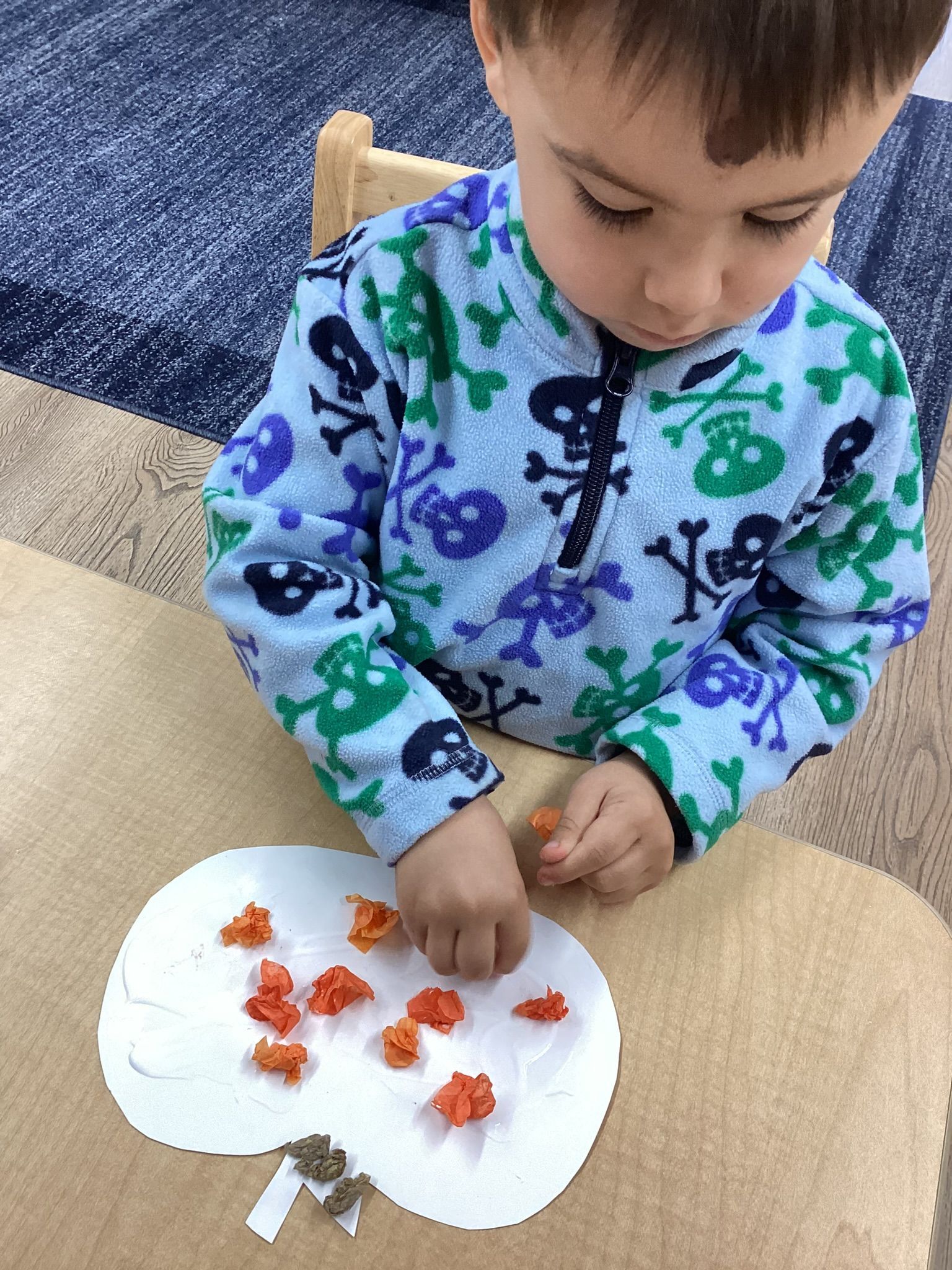 In March, students had a wonderful time becoming paleontologists and learning the different names of dinosaurs in Spanish! They practiced saying these names and enjoyed learning about what made each dinosaur unique. We also discussed what different dinosaurs ate including herbivores, carnivores, and omnivores. The children learned that the Triceratops ate plants (herbivores), while the Tyrannosaurus Rex was a carnivore and loved to eat meat. For their dinosaur craft, students cut out a dinosaur template and added colorful pom poms to represent the dinosaur's body, spikes, and other features. In the math area students used mini dinosaur erasers to reinforce one-to-one correspondence and number recognition. At the end of the month, we explored what happened to the dinosaurs. The children were fascinated to learn about the asteroid that hit the coast of Mexico and changed the world. Students were amazed to learn that some dinosaurs went extinct while others evolved into birds.