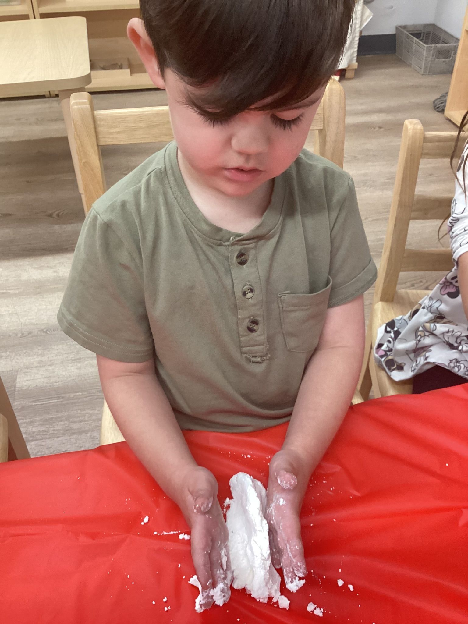 In February we celebrated Valentine’s Day with an awesome class party. We enjoyed sensory play with colored rice that some friends helped me dye with food coloring and vinegar. We decorated our classroom with paper hearts, some with watercolor and coffee filters and red paper hearts folded in half to make a symmetrical painting. The children have been very busy making chalk drawings outside and request their teacher to draw them pictures. It’s also a fun time to review our letter of the week and what begins with that letter. This month we learned all about what it means to be a friend. We are working on having gentle hands, keeping our hands to ourselves, and to give our friends hugs and gentle pats when they are sad. Each day we practice waiting our turn and sharing our work when we are done with it. We have had a lot of rainy days this month, but that doesn’t stop us from having fun. The kids loved making clay sculptures and making their own play dough together as a class.