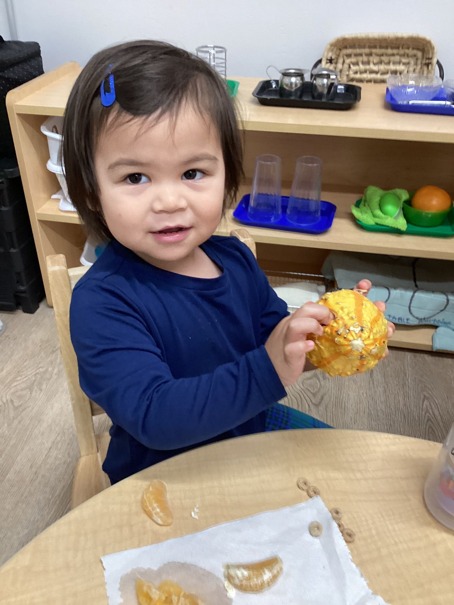 For Thanksgiving, the students created their own version of turkeys. Some classes used paper to paste together a turkey and other classrooms created hand turkeys. Many classes also used fallen leaves to create special fall art projects. The primary classrooms created pressed leaf art using chalk and leaves, while our preprimary classroom dipped their leaves in paint and used those to transfer the print to paper. In November, we also had our Harvest Feast! Thank you, families, for helping us put together a delicious Harvest Feast buffet. The children got to try some foods they don’t typically see on our school menu. November was amazing and now we look ahead to December.