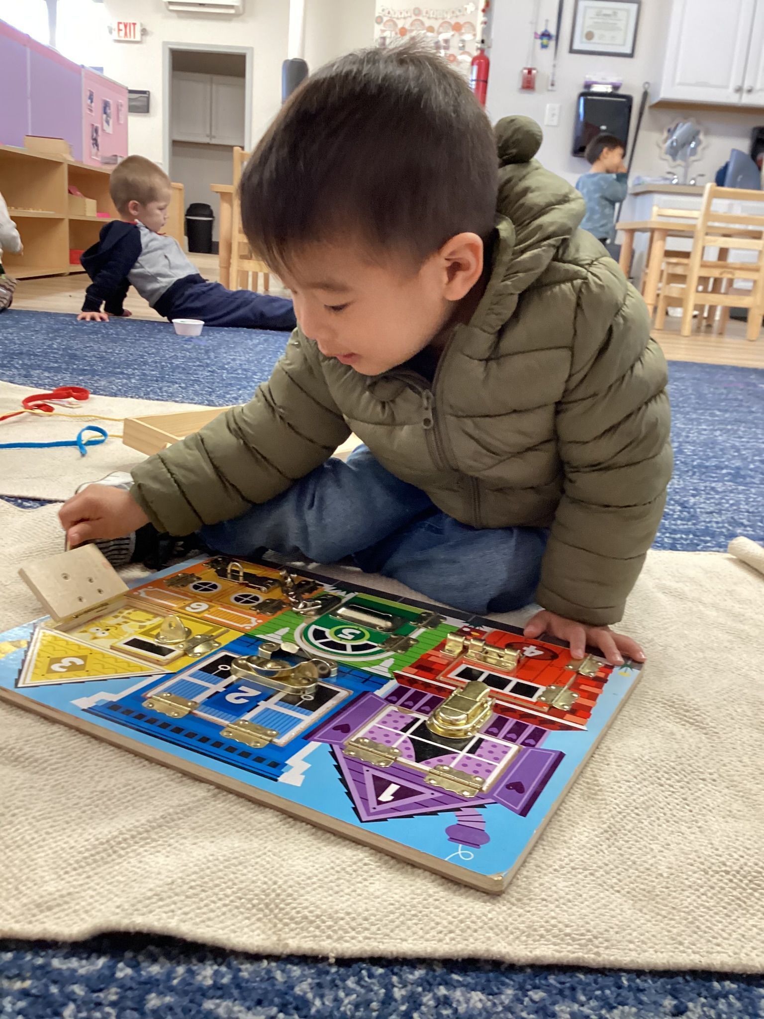 January was a month filled with foggy mornings and windy and chilly nights. As we learned about winter and the animals and hibernation, we created some fun arts and crafts. Our two most favorite artwork for this month we created was a bear in a tent, and making fake snow! We also read our book of the month The Mitten by Jan Brett during our daily circle time, and enjoyed all the fun animals that came along with the book. Our Art enrichment was based on The Mitten , as a class we were able to color, decorate, and place our animals on our mittens. As a whole we practiced the sounds of the letters “o,p,q, r” and were able to match pictures that begin with the sound. We also made a “Land and Water” sensorial bag.