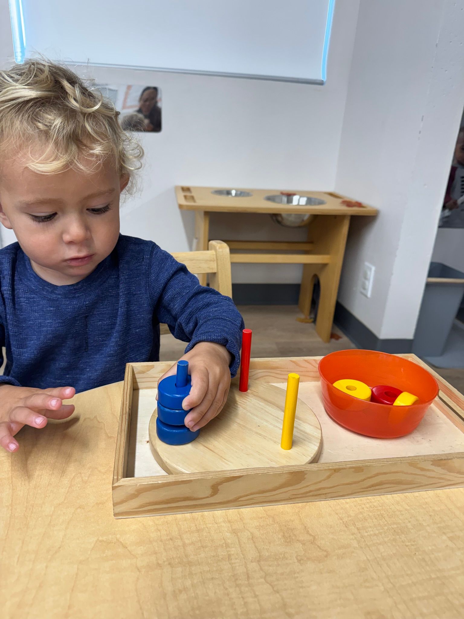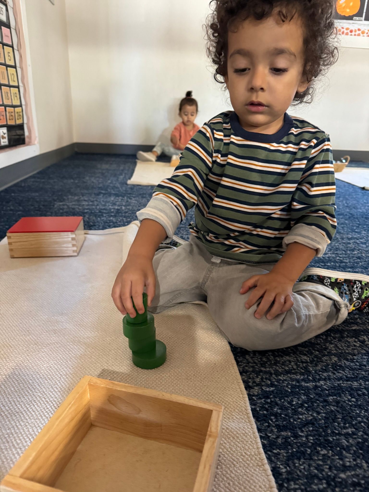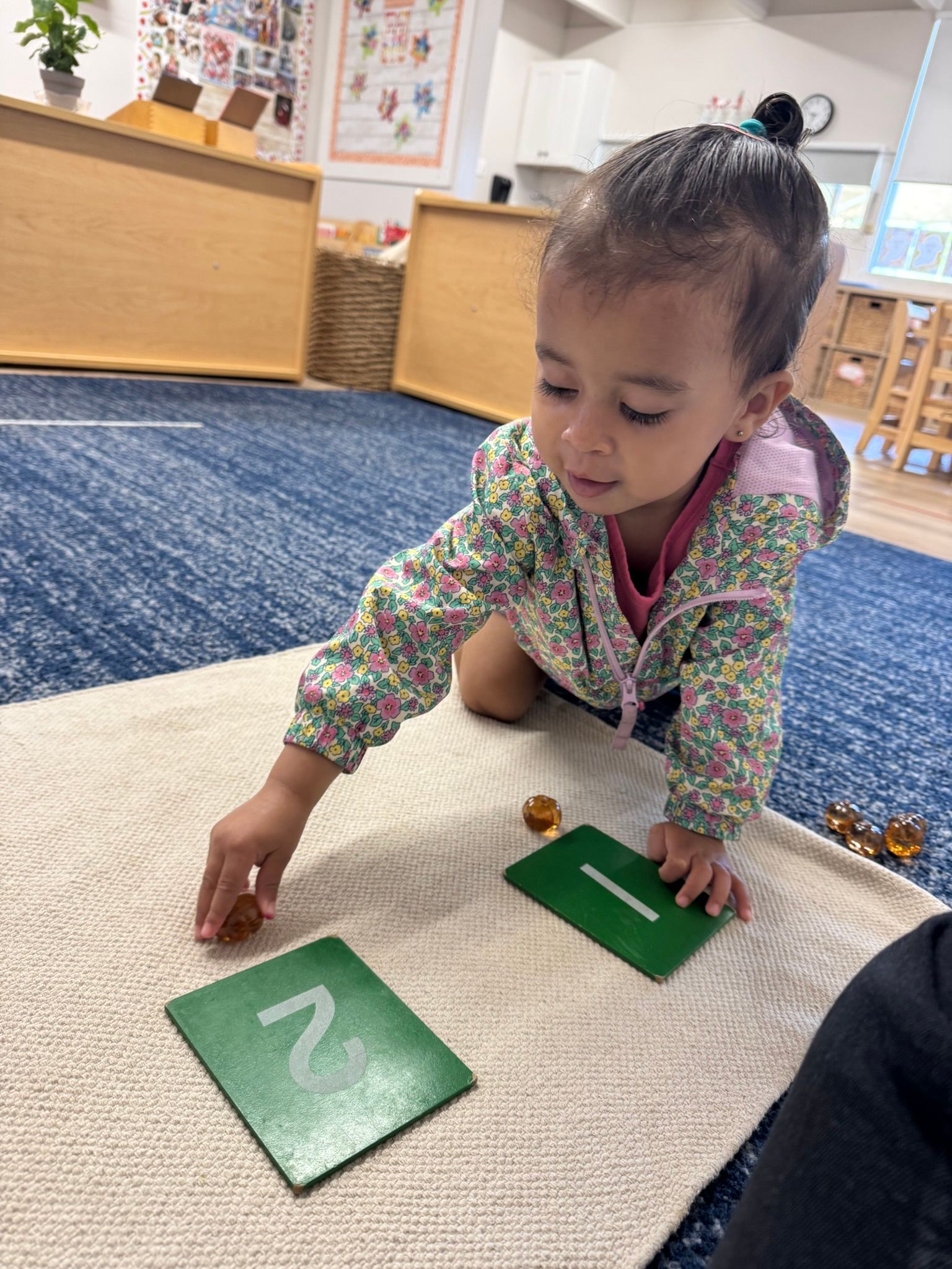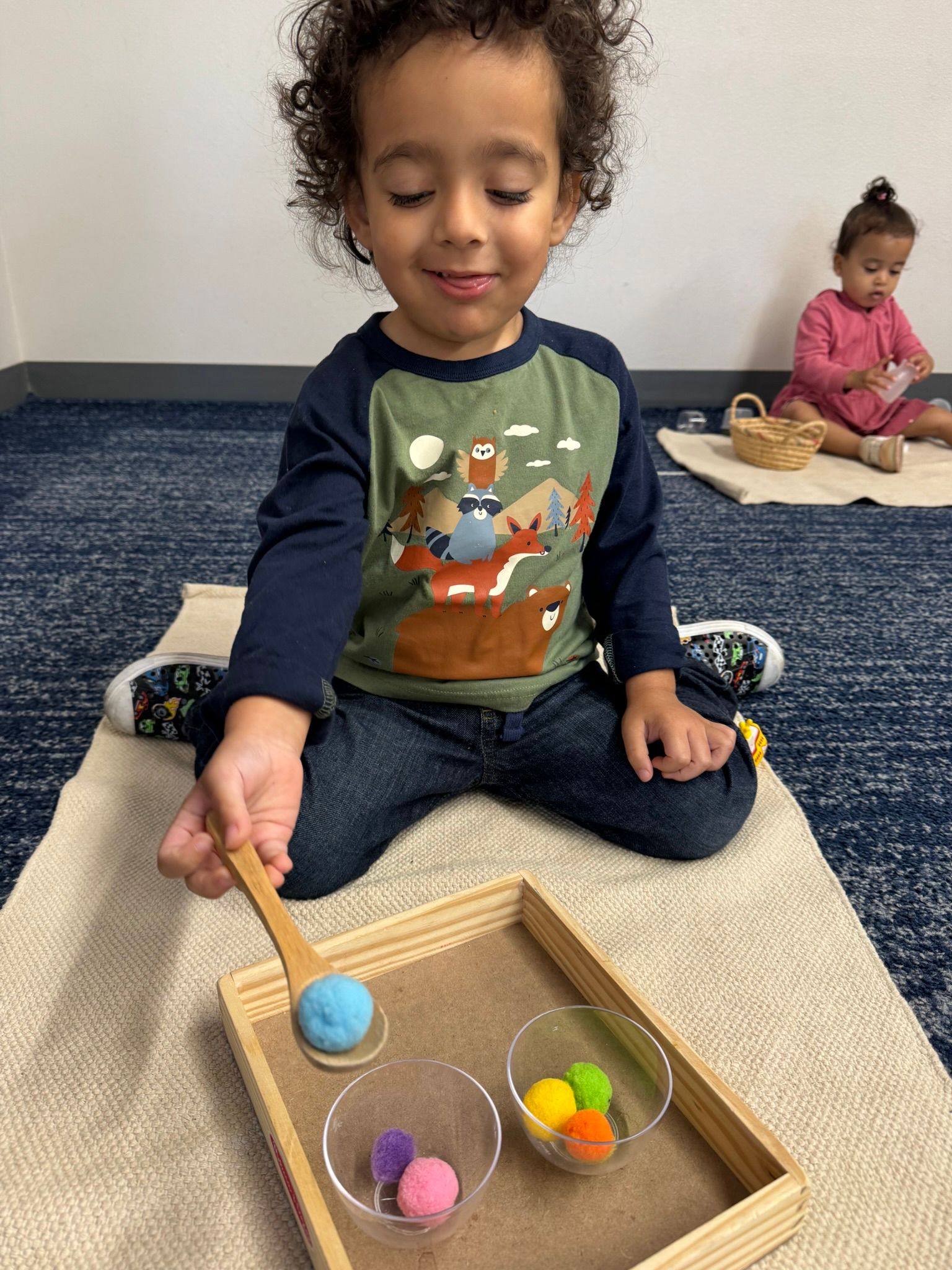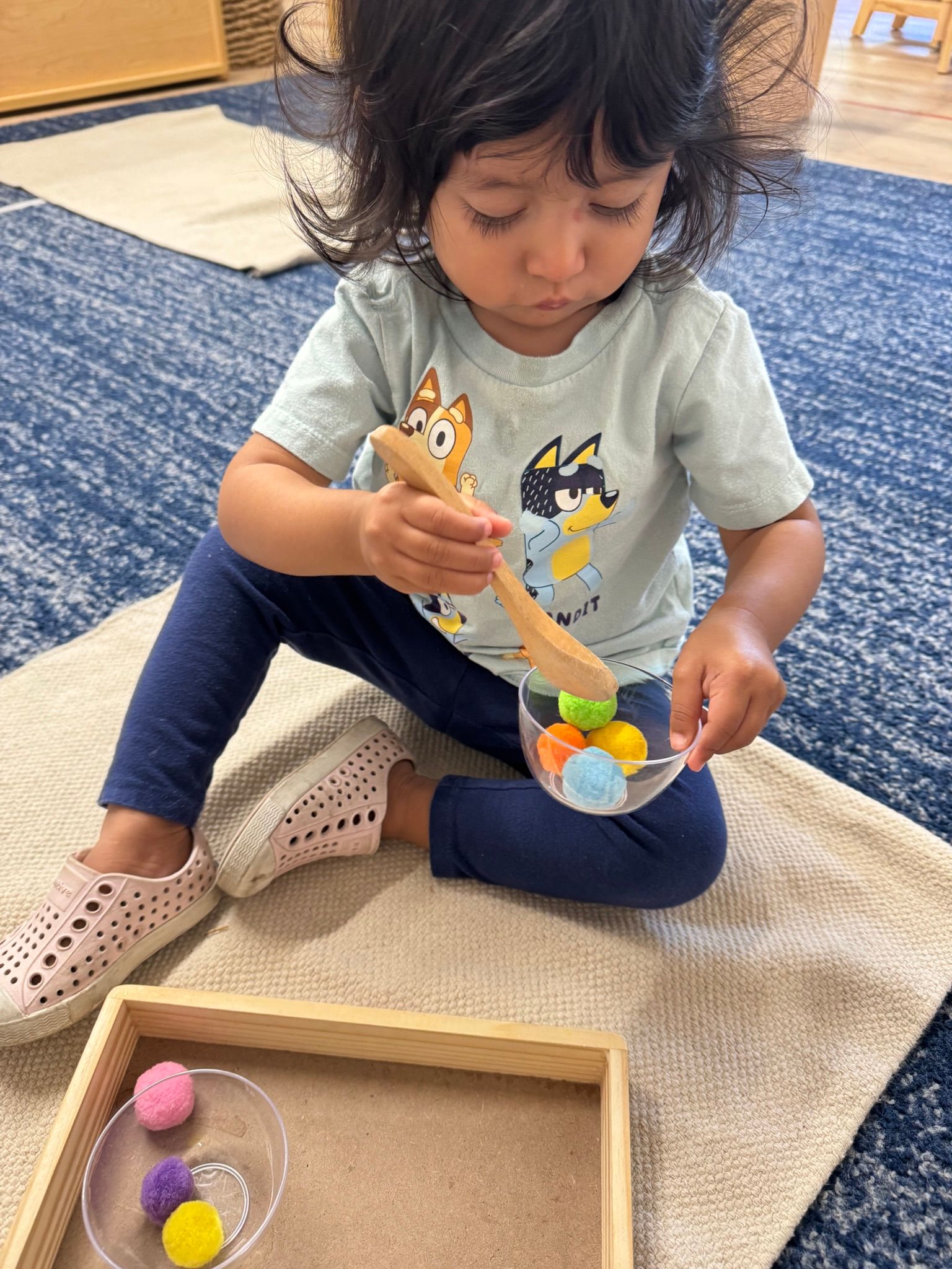 In Practical Life, we focused on important everyday skills– practicing how to push in our chairs after sitting, handing objects to teachers properly, and transferring objects from one bowl to another with care and concentration.