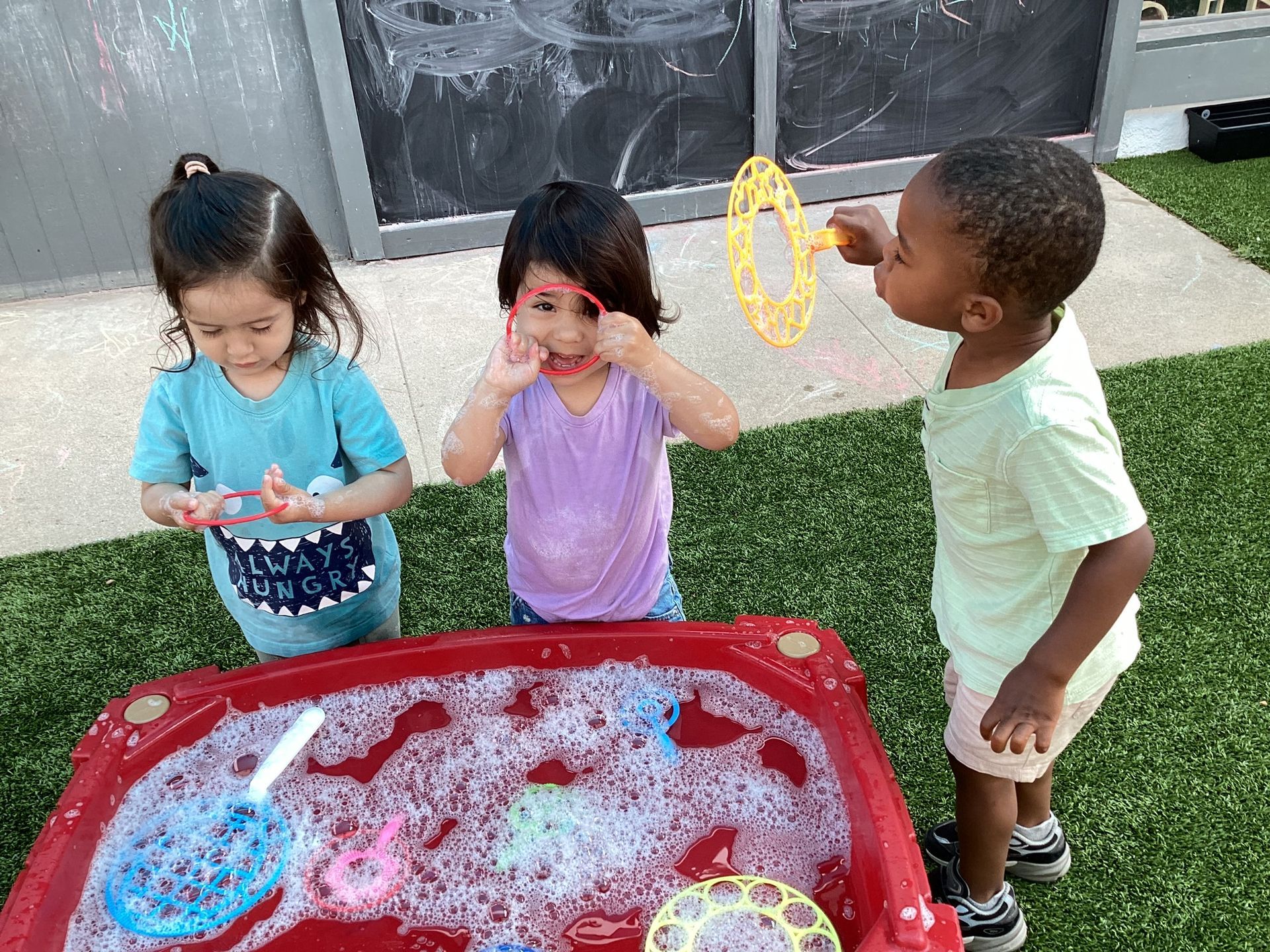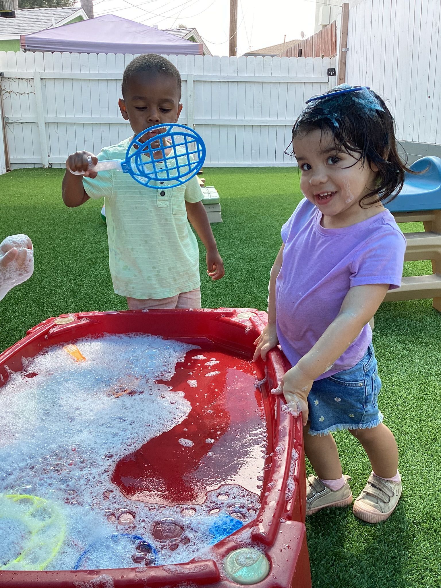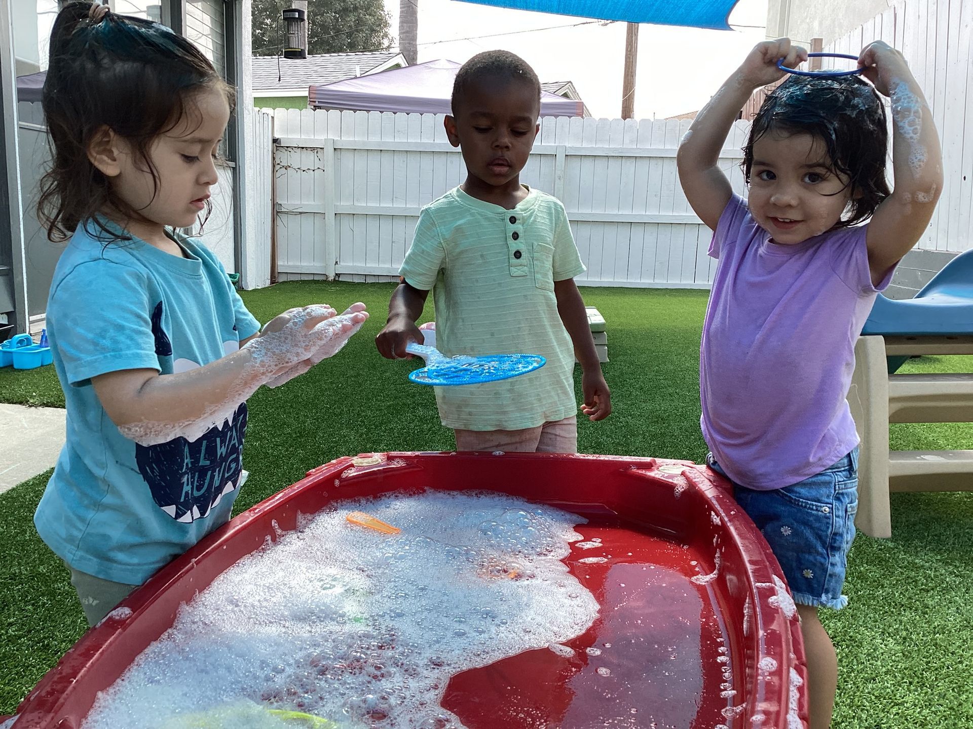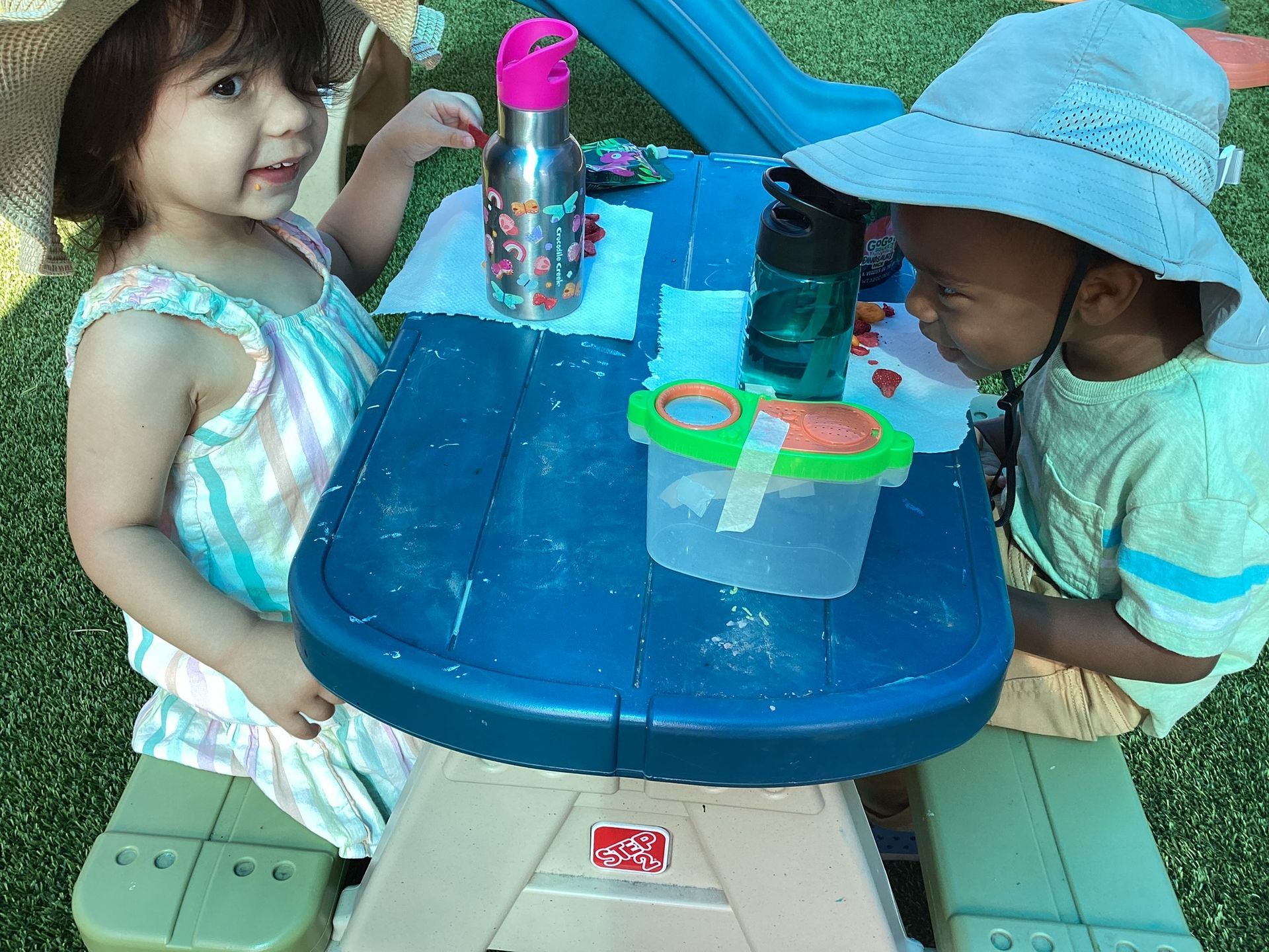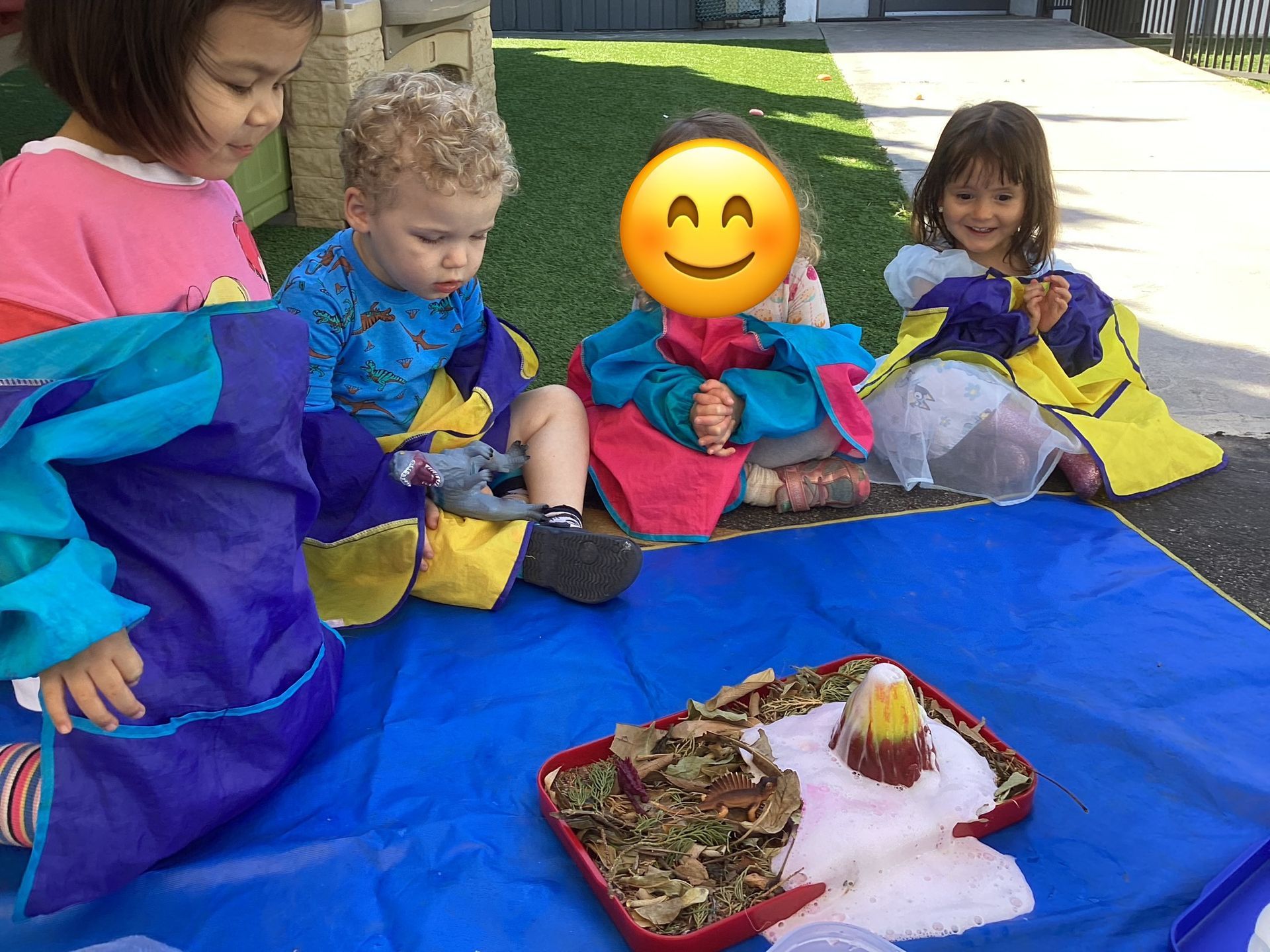 Our T2 Class had so much fun this summer! We played in the water every chance we could. We enjoyed blowing bubbles, splashing in the pool, and used paint brushes to swirl and mix water soluble paint mixed with bubbles. The treat of choice in the sun were our homemade popsicles that tasted great as they helped us stay cool at play. We had so many interesting weeks of themes, too! One was Down on the Farm, with sorting work of which objects are on a farm and which objects are found in a city? There was a Volcano theme where our toddlers helped to make cake batter and homemade frosting to spread on our individual volcano cakes. They were so yummy and there wasn’t a chance they would erupt because they were gobbled up so quick! As a science experiment, when we had enough of the popsicles, we’d set them in the sun and watch how the sun sets them on the ground to watch how the sun changed them into liquid before our eyes! Our Camping theme was unique to pretend to be sleeping under the stars and listening to the sounds of the animals at night and some sounds of our own. Our teacher even made stars to shine on the ceiling and we enjoyed a marshmallow that we roasted over a pretend fire! Since we can’t afford the airfare to Paris for the Olympic Games, we made our own obstacle course and at the end of the race, we all got a Gold Medal we made to wear around our necks and a very special torch with the flames in the shape of our own handprints!