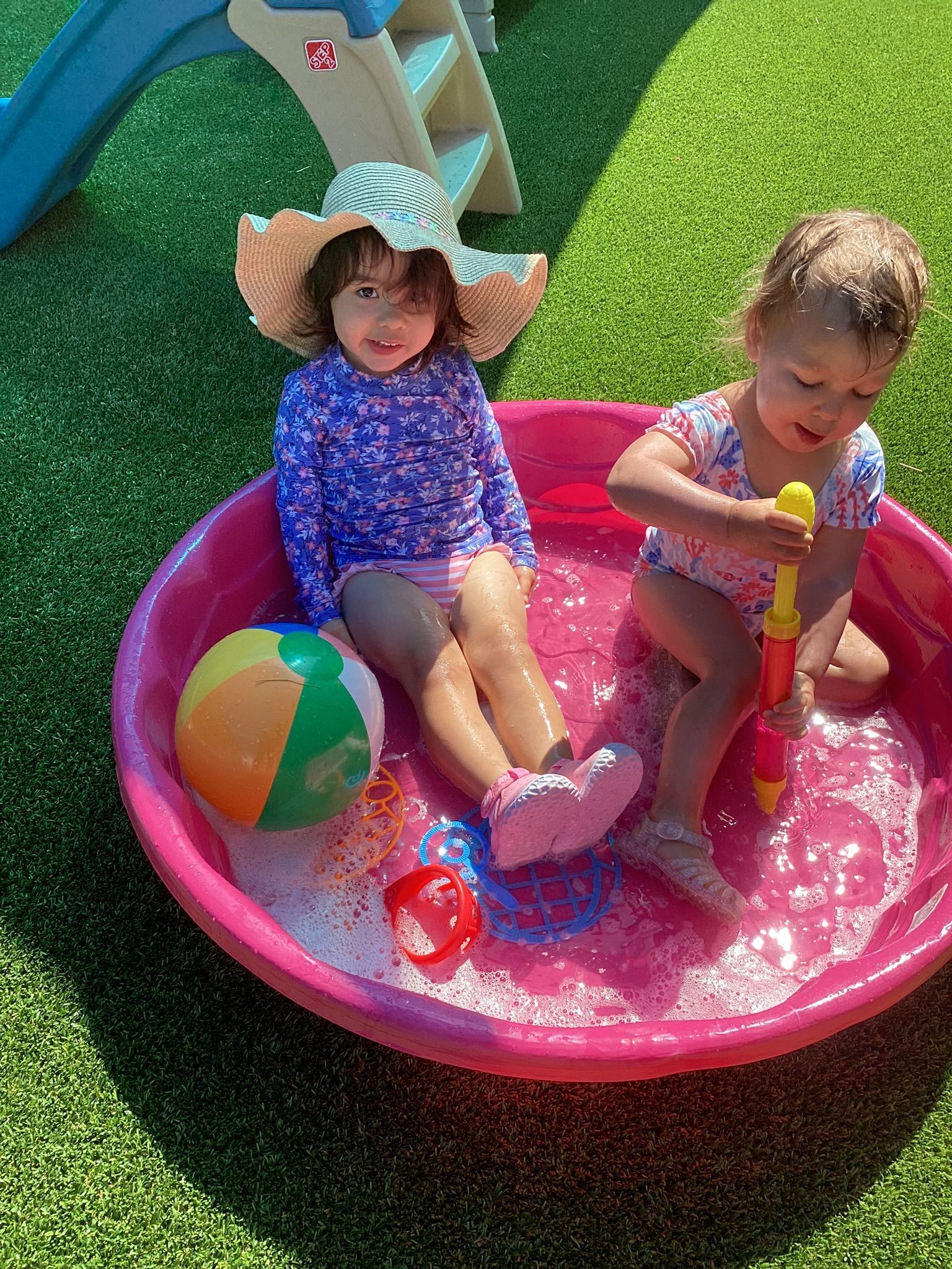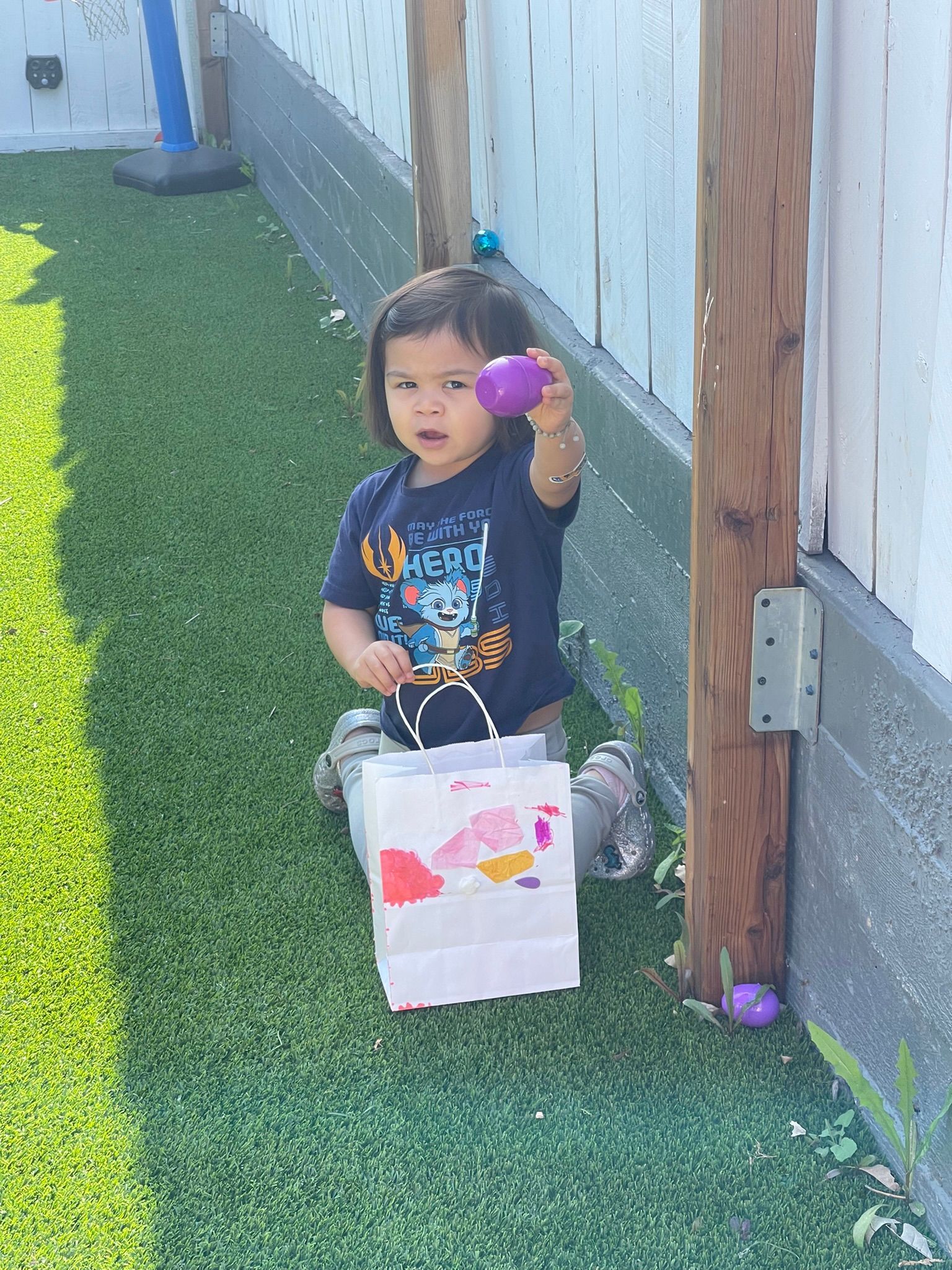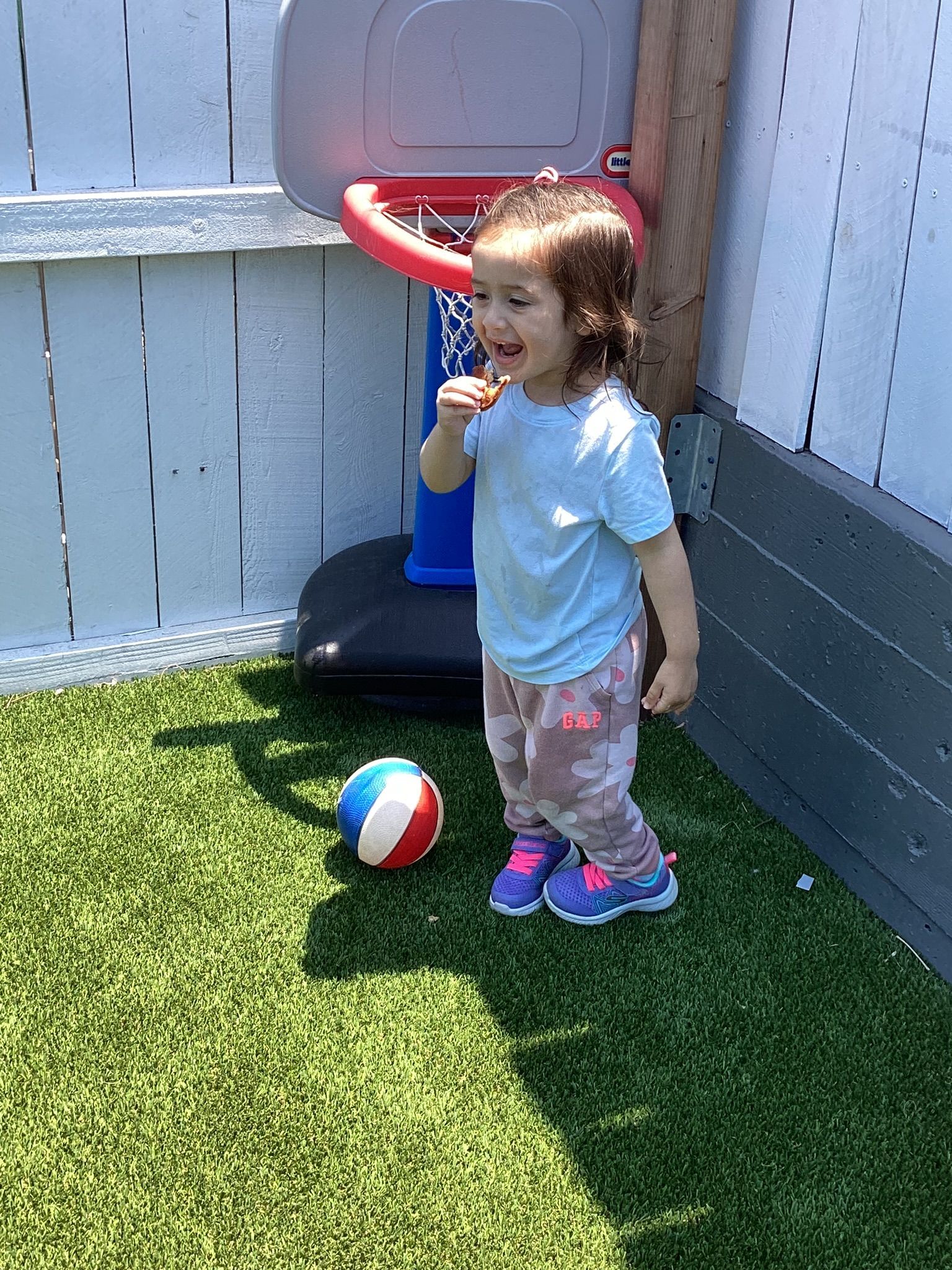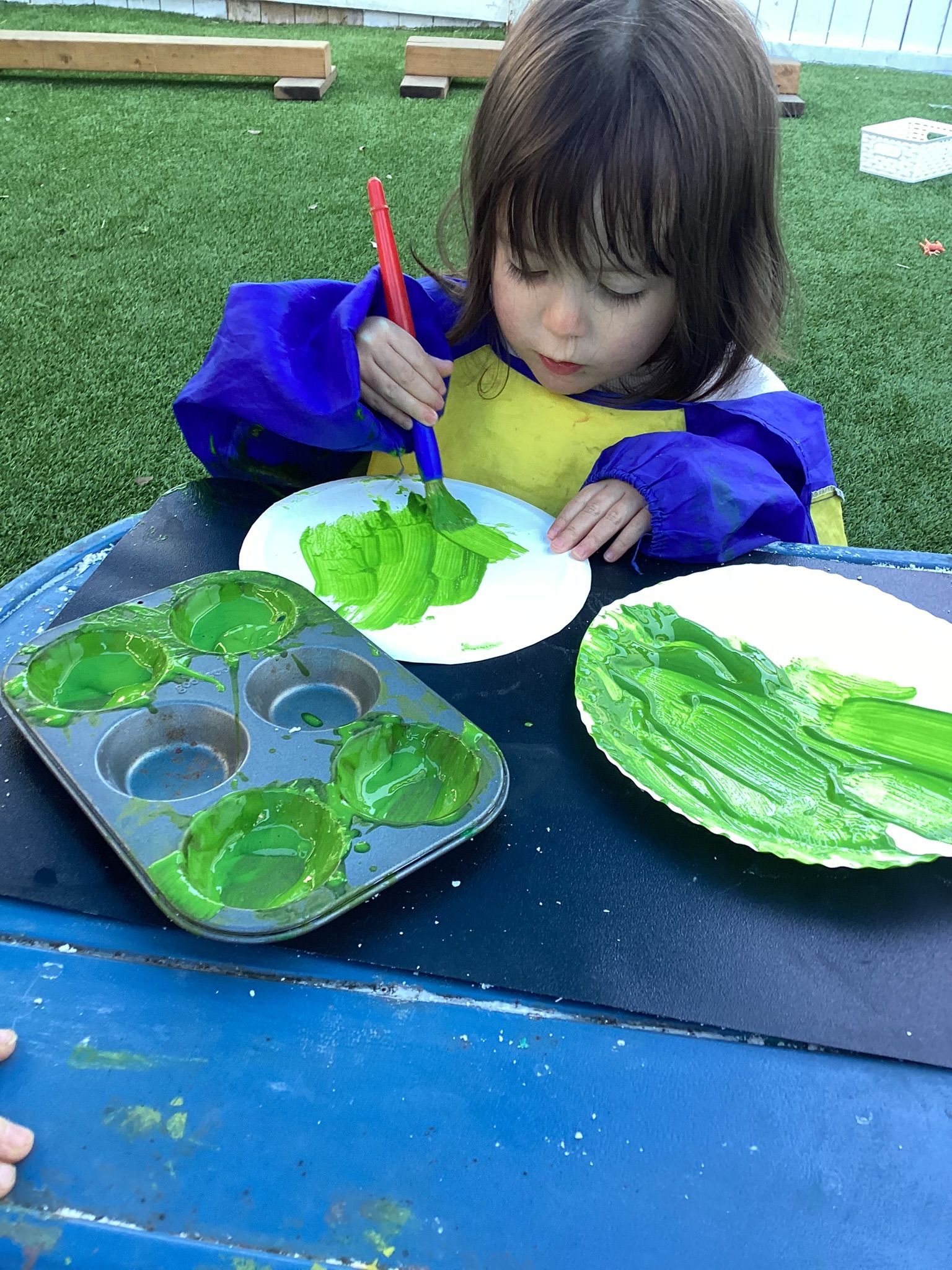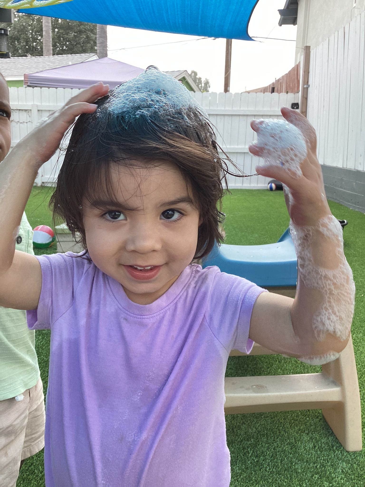 Our T2 Class had so much fun this summer! We played in the water every chance we could. We enjoyed blowing bubbles, splashing in the pool, and used paint brushes to swirl and mix water soluble paint mixed with bubbles. The treat of choice in the sun were our homemade popsicles that tasted great as they helped us stay cool at play. We had so many interesting weeks of themes, too! One was Down on the Farm, with sorting work of which objects are on a farm and which objects are found in a city? There was a Volcano theme where our toddlers helped to make cake batter and homemade frosting to spread on our individual volcano cakes. They were so yummy and there wasn’t a chance they would erupt because they were gobbled up so quick! As a science experiment, when we had enough of the popsicles, we’d set them in the sun and watch how the sun sets them on the ground to watch how the sun changed them into liquid before our eyes! Our Camping theme was unique to pretend to be sleeping under the stars and listening to the sounds of the animals at night and some sounds of our own. Our teacher even made stars to shine on the ceiling and we enjoyed a marshmallow that we roasted over a pretend fire! Since we can’t afford the airfare to Paris for the Olympic Games, we made our own obstacle course and at the end of the race, we all got a Gold Medal we made to wear around our necks and a very special torch with the flames in the shape of our own handprints!