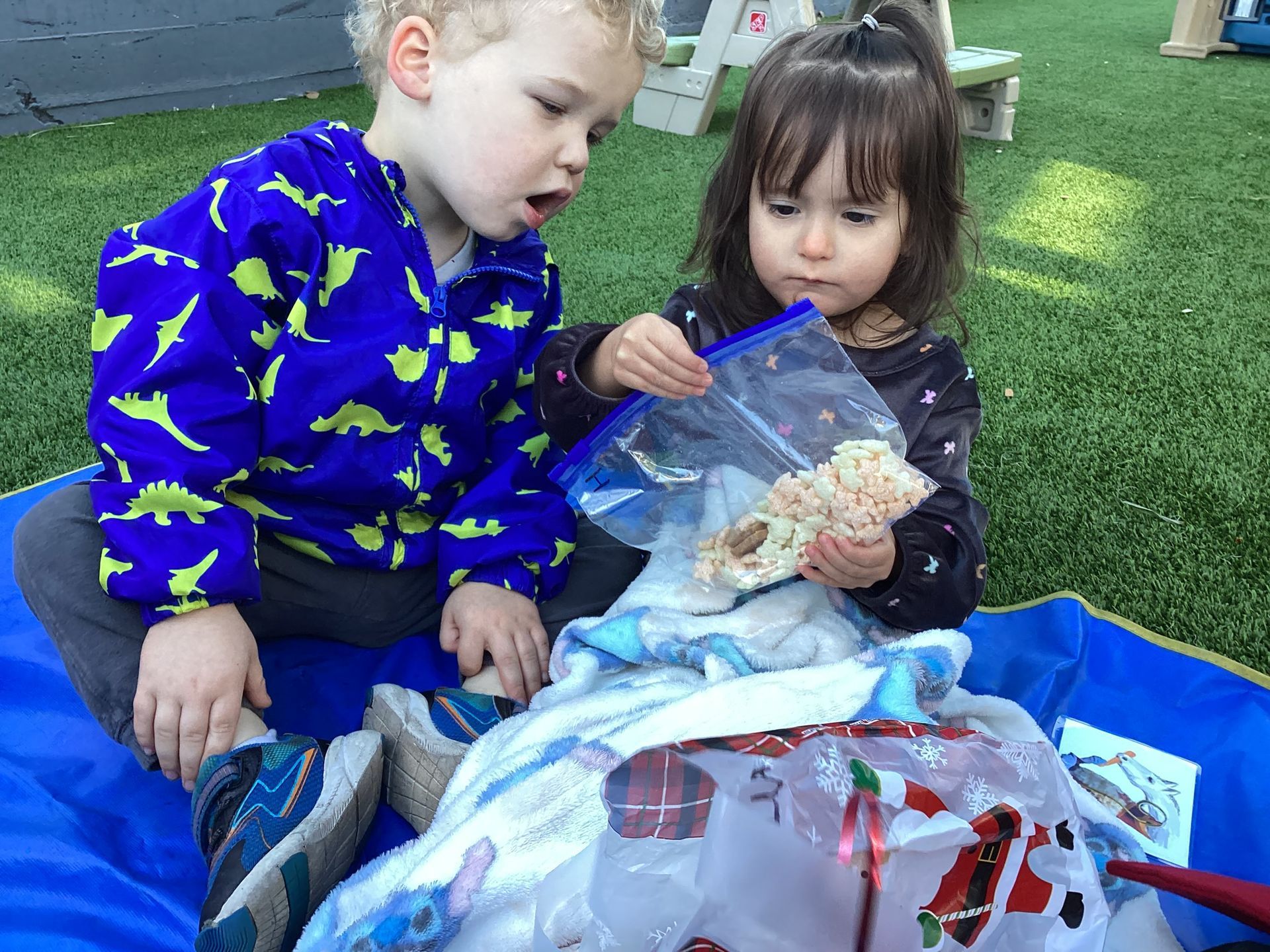 The lower temperatures in December certainly helped to get us into the holiday spirits! We learned that there are celebrations in other parts of the world, besides our continent of North America where we celebrate Santa Claus who rides in a sleigh pulled by reindeer bringing gifts to good little boys and girls. And a visit from Santa! On Dec 5 it’s “Christmas Eve” in Europe, specifically The Netherlands. Sinterklaas resembles our St. Nick and rides a white steed to deliver goodies to good boys and girls. Our toddlers celebrated by stuffing a large sock with carrots and left them outside over night to feed the white steed. On Dec 6, “Christmas Day,” the children stepped outside to find signs of Sinterklaas’ horse who left bits and pieces of carrots scattered on the grass and hoof prints made on the sidewalk. The children would soon enjoy tasty goodies and treats with their own individual initials! Other cultures celebrate Kwanza, and our class used an interactive Kinara to pretend to light colored candles, and beat a very authentic African drum! And lastly, we celebrated Hanukkah with its unique interactive Menorah candles and spun the Dreidels as we sang its song! All along, we would point out the areas of celebration on our Continent Globe.