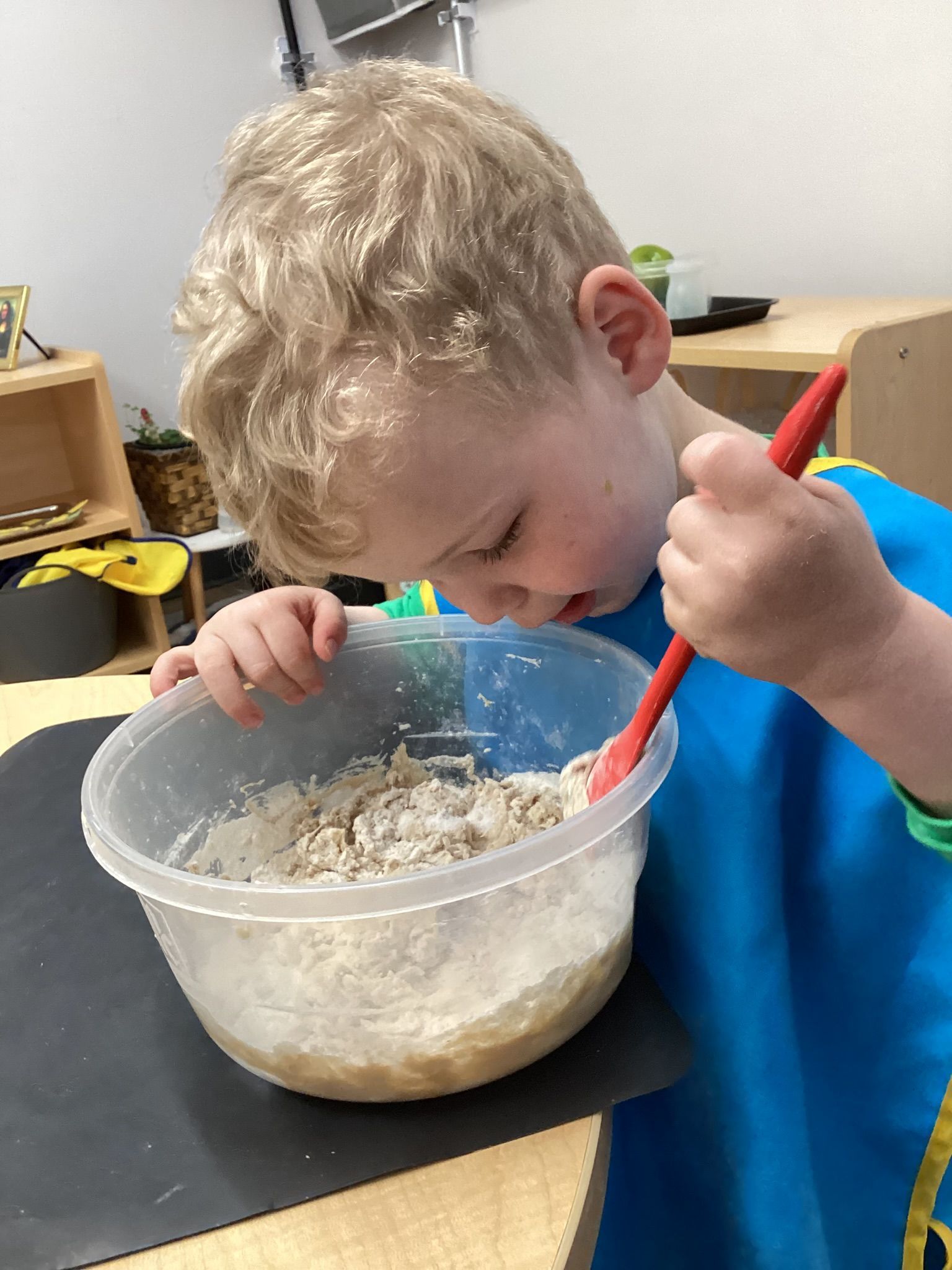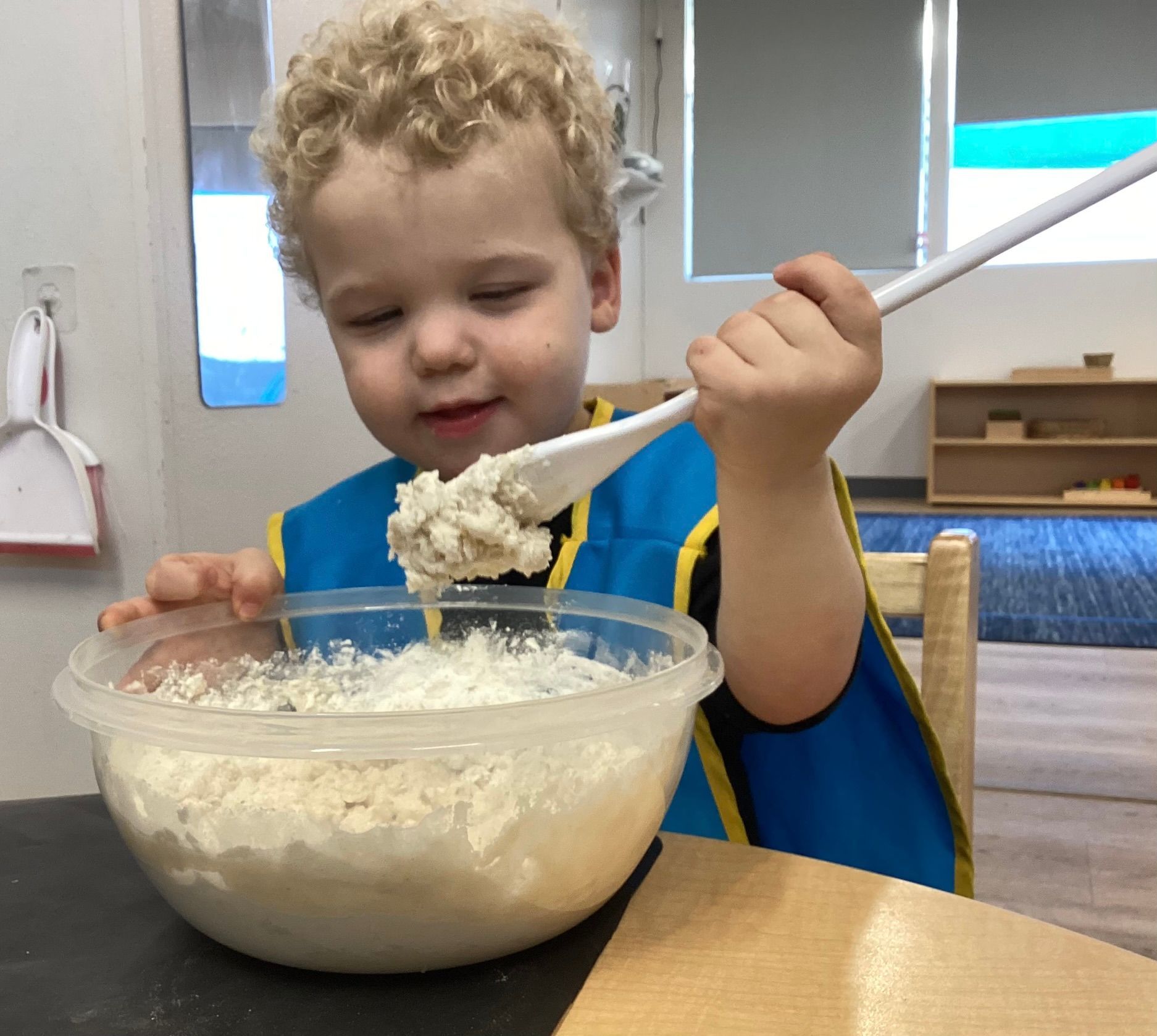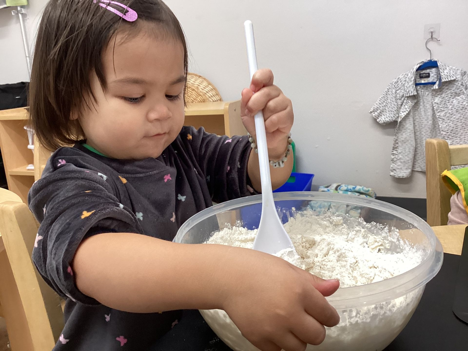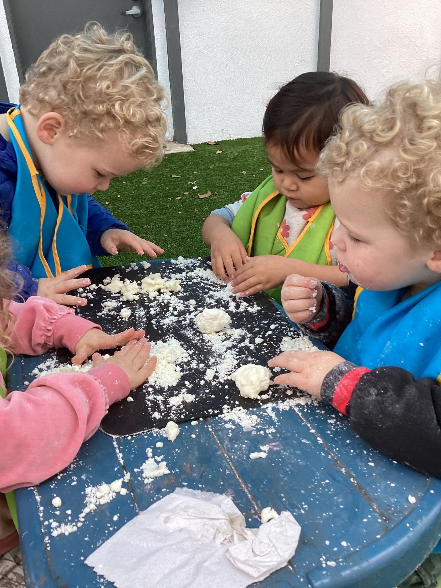 January was filled with learning all about Snow and Cold. Reinforcing this subject area, our toddlers were outside folding in all the ingredients to make our own white “Snow!”