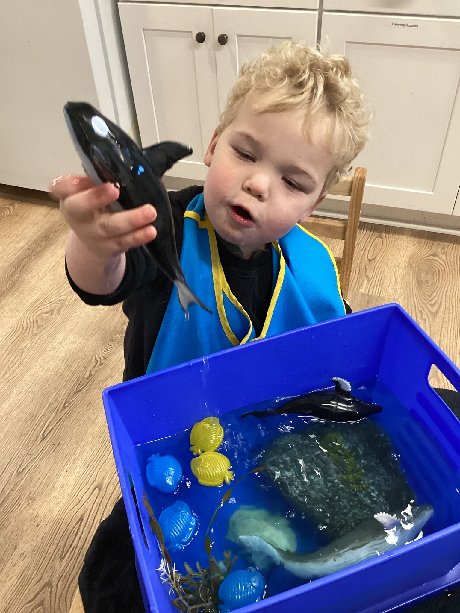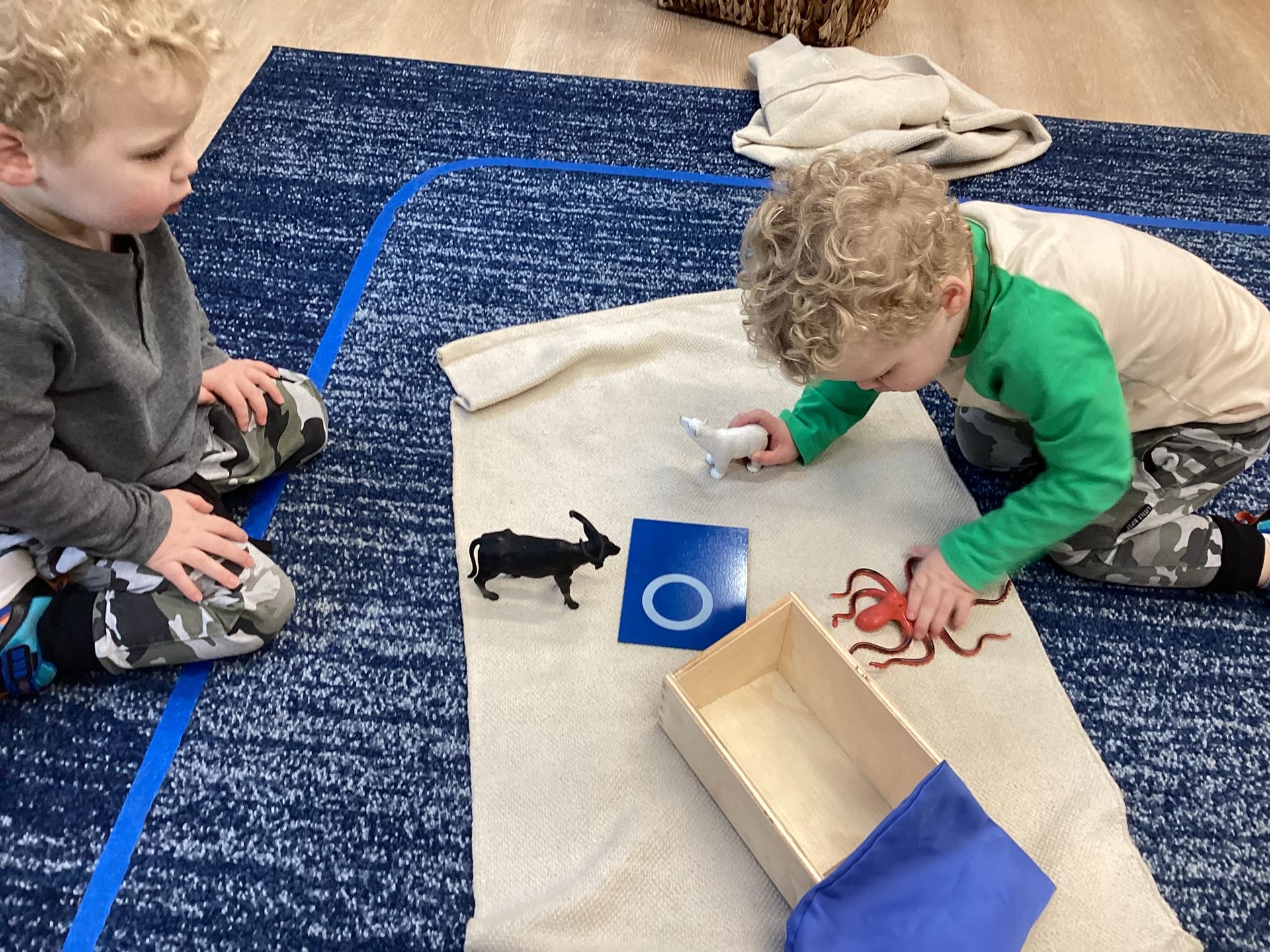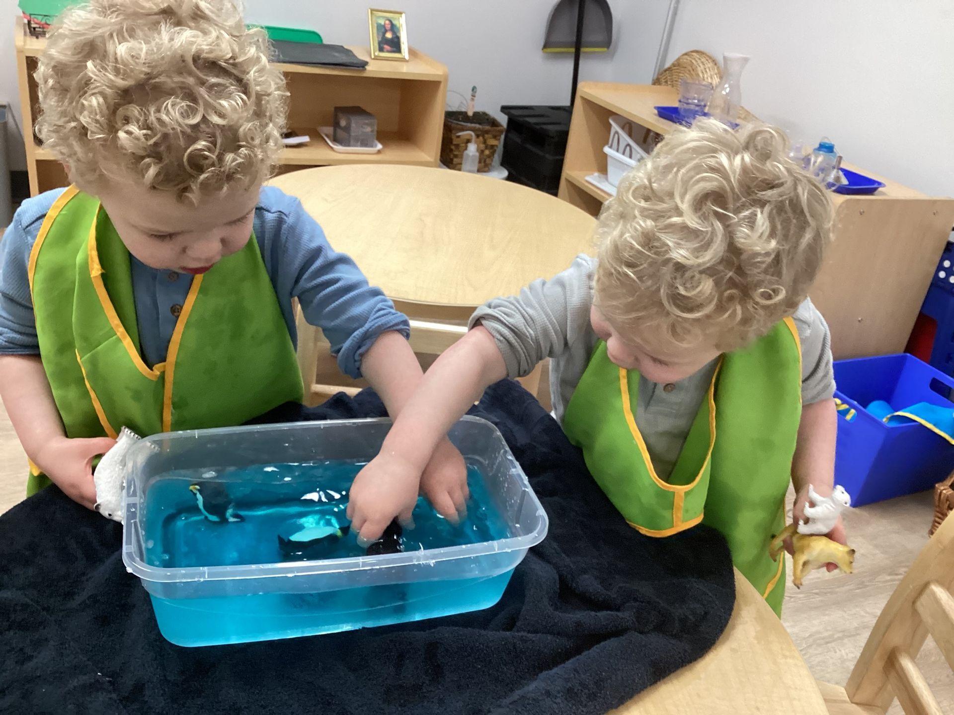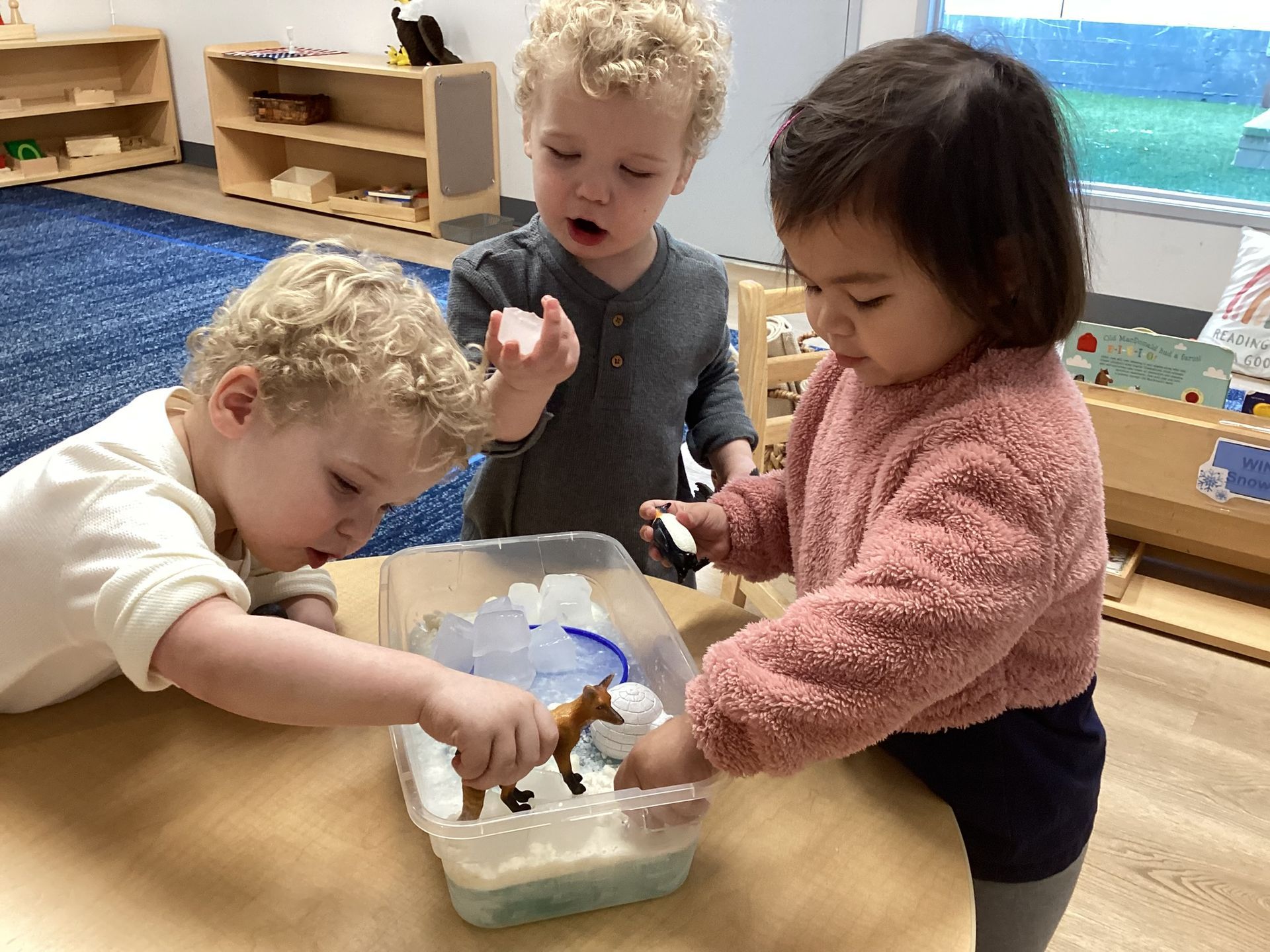 It didn’t take long for our children to throw it up in the air and one child helped join everyone in singing, “Jingle Bells!” The class also made an ice and snow Antarctica environment with icebergs for seals, penguins, and whales. We discussed where the animals go to stay warm and that turtles go through brumation from October- April. Each child then made their own box turtle, too!