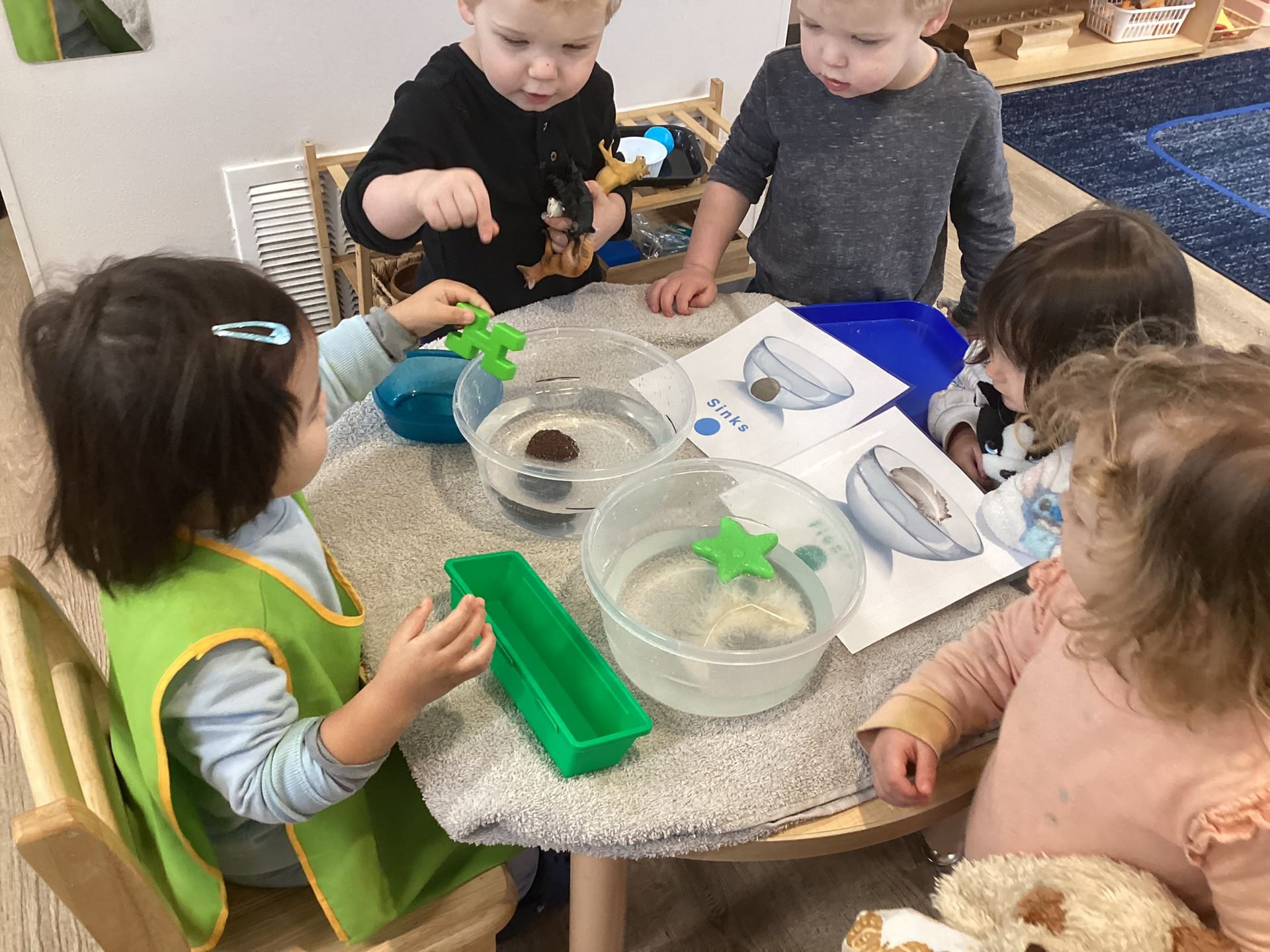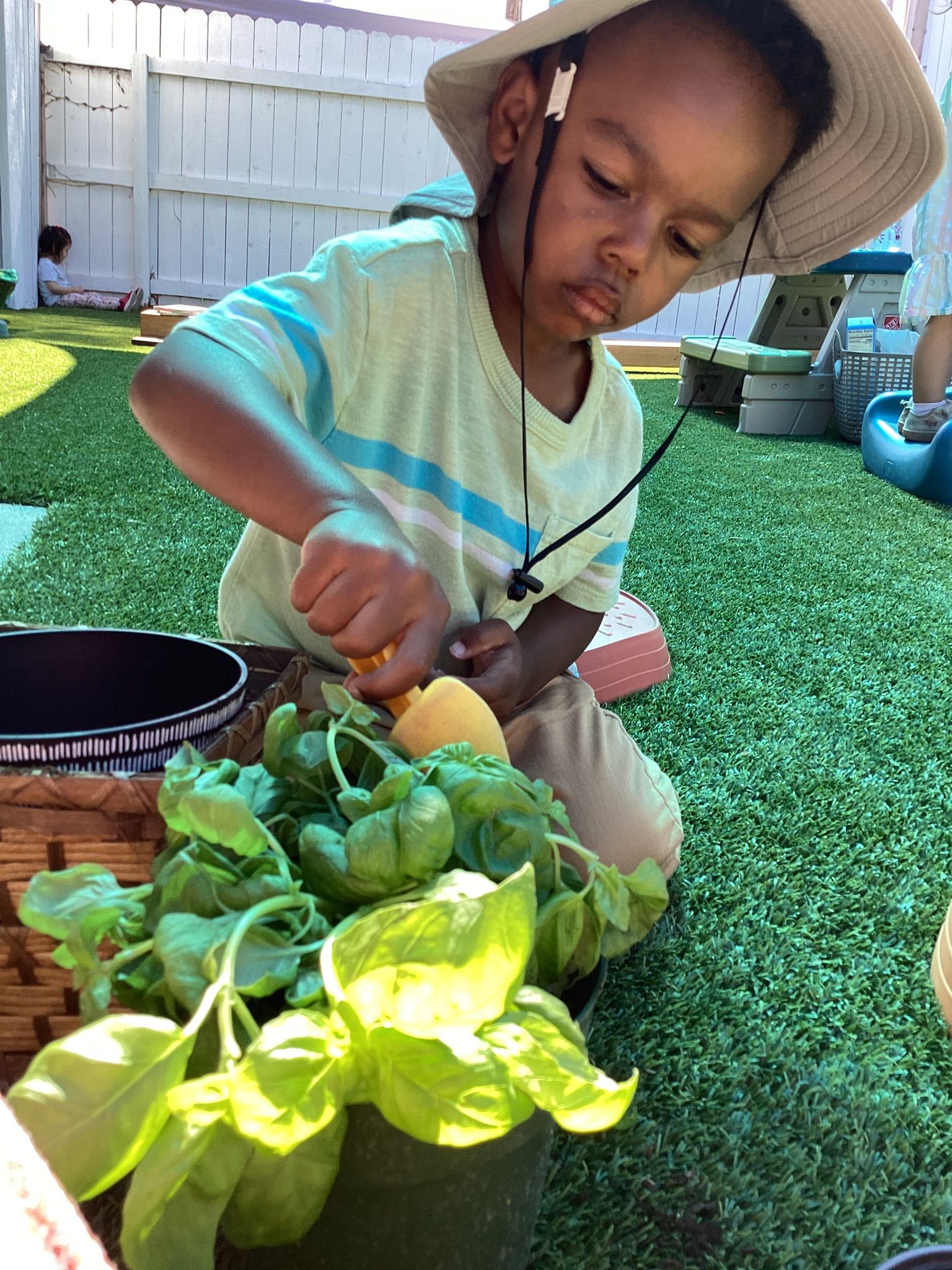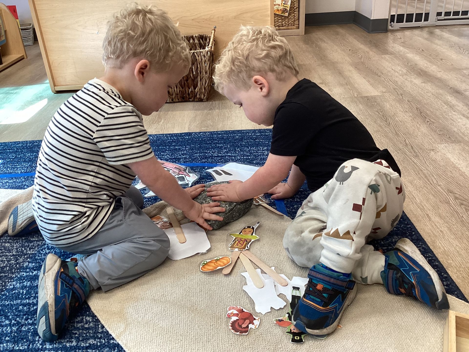 November was such a special month where the children experienced strong brisk winds that swirled the leaves around their feet. Each child this month handed their teacher leaves they found, specifically the leaves changing color: some green, but yellow, in part, and some brown, dry and curled inward. We brought each inside to add to our leaf science work to enjoy viewing under a magnifier. When we sliced open gourds in class a child’s voice raised in excitement pointing to , “The Parts of the Pumpkin,” on the wall noticing the relationship of pulp and seeds in both the gourds and the pumpkin! In Geography, the class used paper figures of Pilgrims and Indigenous people to reenact the landing of the Mayflower to a new world at Plymouth Rock, Massachusetts. They got to touch a “Plymouth Rock” and identify where it happened on an interactive map of 1620. The letter sounds for November were, “i,” “j,” and “k,” with objects like iguana, jaguar, and kangaroo. Circle Time was fun; we practiced walking quickly, flapping our wings and the familiar, “Gobble, Gobble!” as we pretended to be the farmer. Along with the book, “To Fill a Bucket,” we showed kindness to each other with hugs as we took turns passing a bucket with a red heart. As we near Thanksgiving, the children continue to practice their manners at the table, carving a make-believe Turkey and learning to set the table.