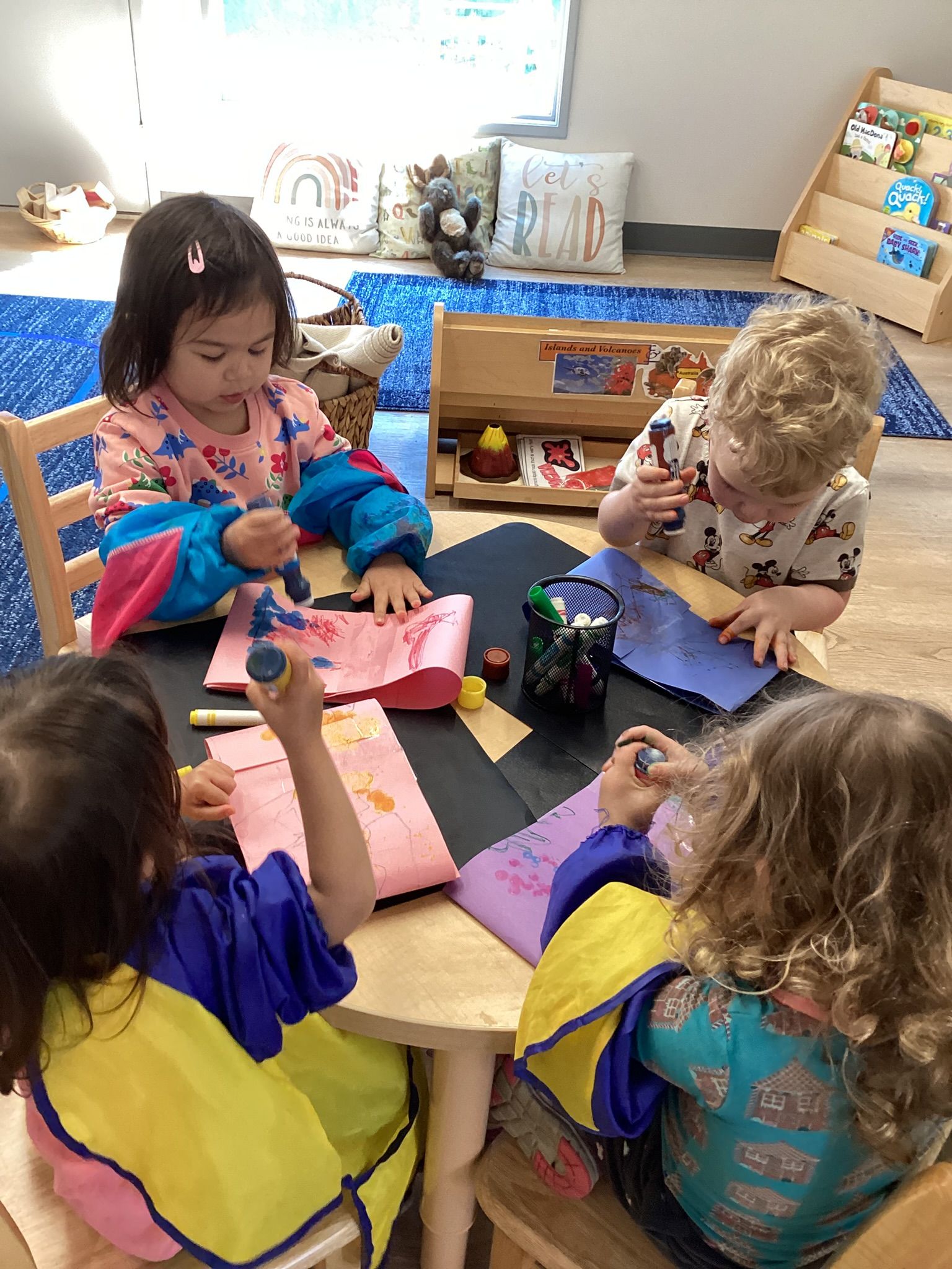 April was time for Spring flowers and more fun in the sun! Our theme was Islands and Volcanoes, and we learned that some volcanoes erupt and some are dormant. They are in an area called The Pacific Ring of Fire. We made our own volcanic environment and erupted the volcano together in class. We studied some wildlife that live in Australia like the Koala Bears, Platypus and the Kangaroo. Then we made a group art of the Kangaroo Island where you can see numerous kangaroos hopping all over the island. If you take a walk, there, you can see Koala bears, too!